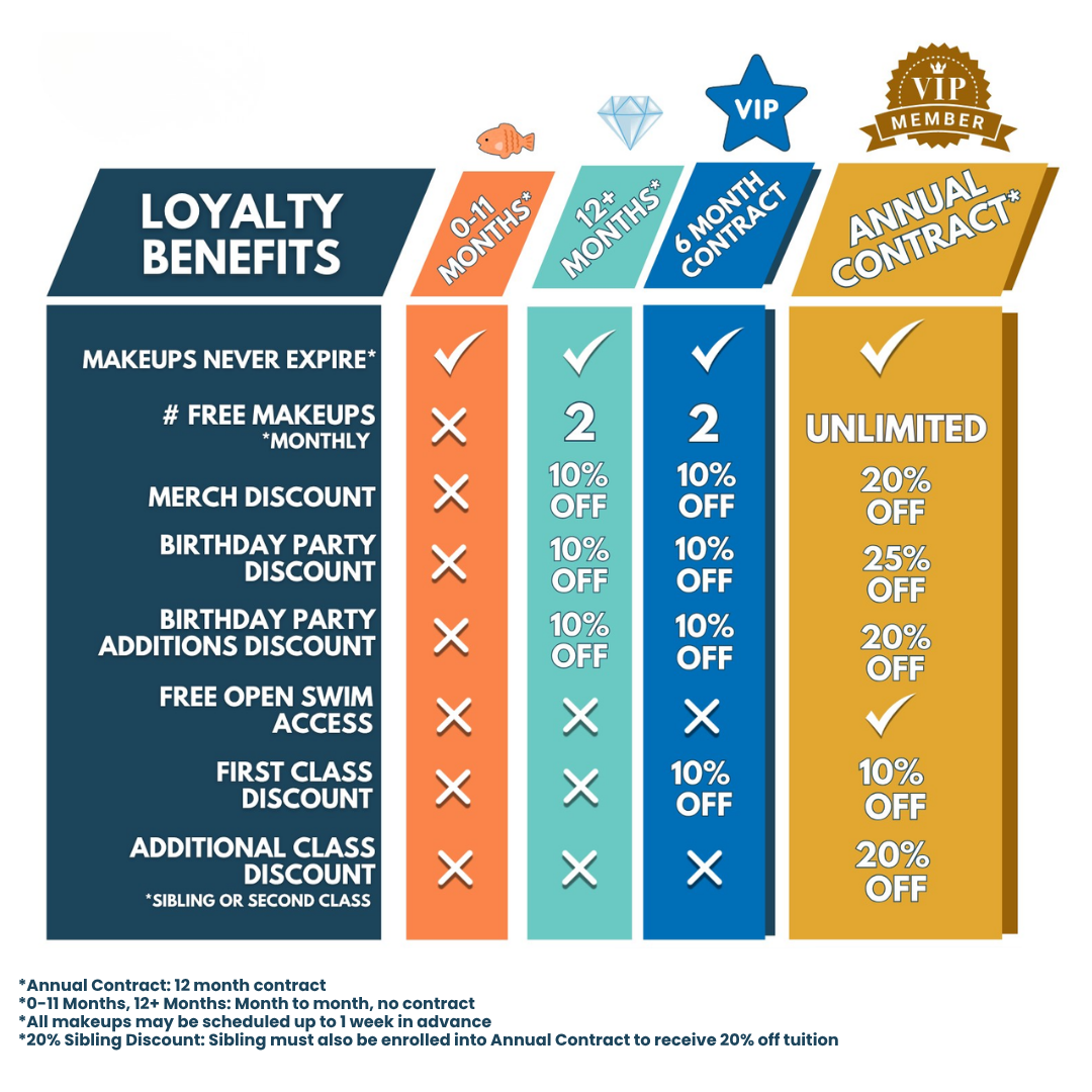 We are excited to announce the permanent addition of swim lesson contracts! These contracts are still billed monthly, however they offer a variety of lasting benefits. This is our way of saying “thank you” for committing to our swim lesson program! From unlimited makeups to birthday party discounts, there is a perk for everyone!